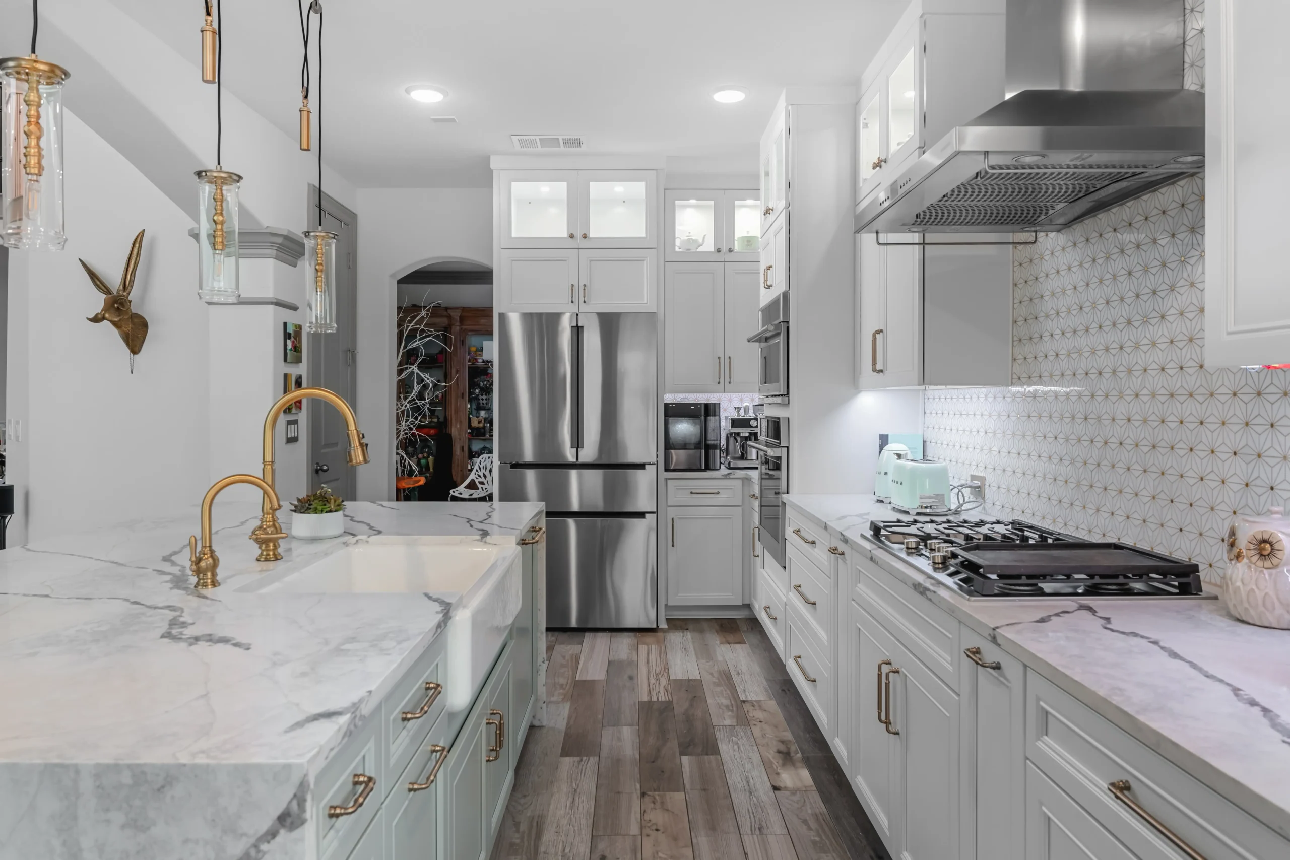 Every detail, from the stylish pot filler to the ample cabinetry, has been thoughtfully chosen to create a kitchen that’s both beautiful and practical. It’s a space designed for making memories, where every meal is a celebration.